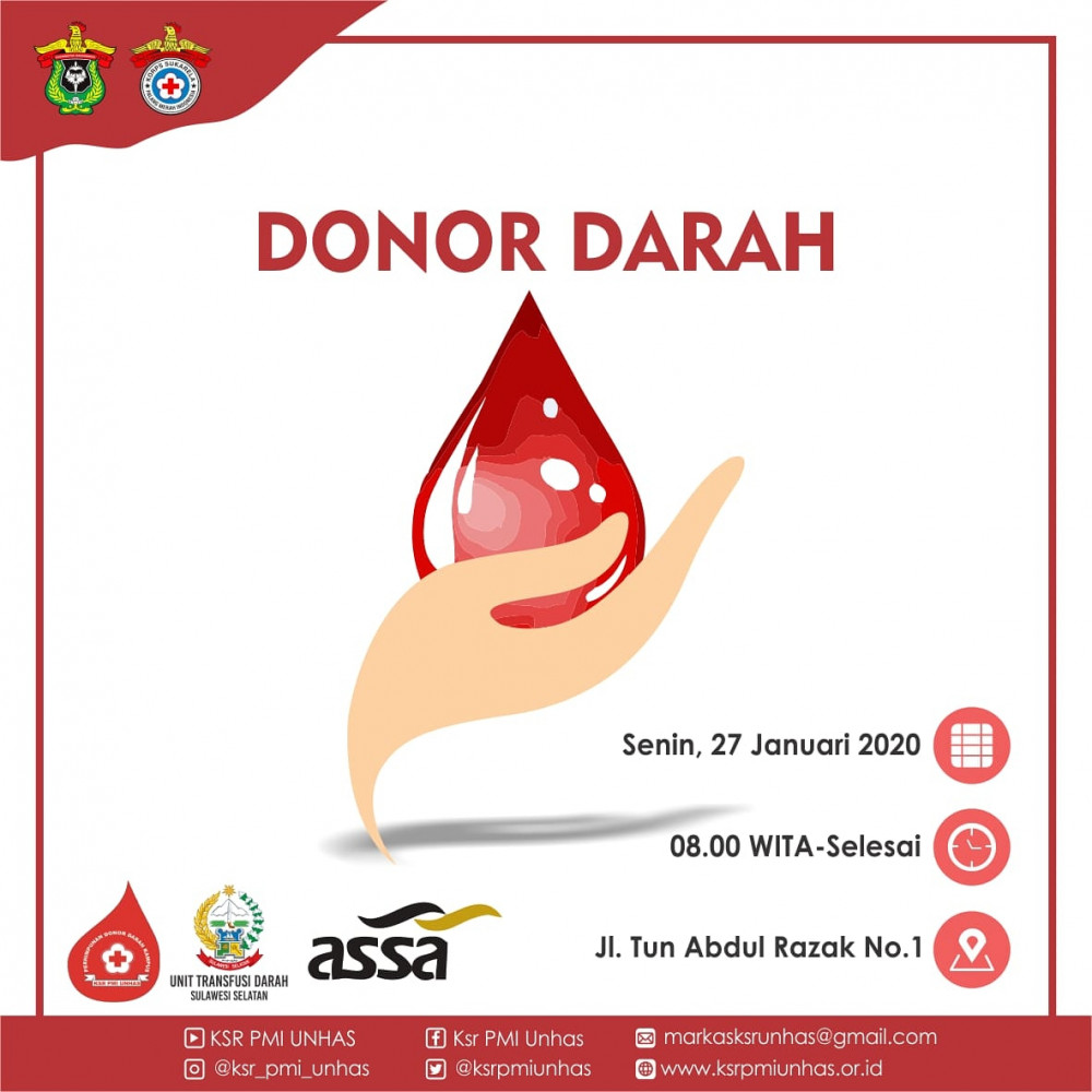 Halo teman-teman kami dari UKM KSR PMI UNHAS mengajak teman-teman untuk hadir dan ikut berpartisipasi dalam kegiatan Donor Darah kami yang dilaksanakan pada: