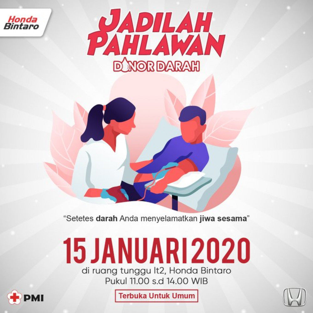 Hai teman Honda, Setetes darahmu selamatkan sejuta jiwa. Ayo ikut donor darah, buktikan kamu mengasihi sesama. Catat tanggalnya dan jangan lupa datang ya