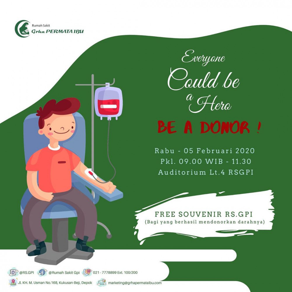 By @depokita : Ayo datang dan berpartisipasi dalam kegiatan Donor Darah yang akan dilaksanakan pada Rabu, 5 Februari 2020, pukul 09.00-11.30 WIB di Auditorium lantai 4 RS Grha Permata Ibu. Free souvenir bagi yang berhasil mendonorkan darah.