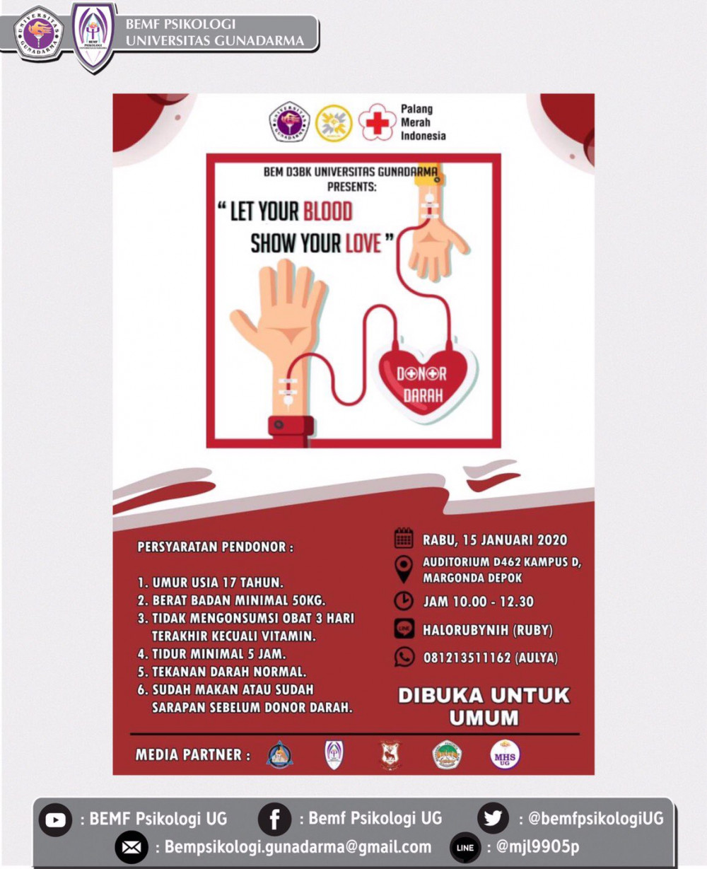 Hallo Psychofams! BEM Diploma Tiga Bisnis dan Kewirausahaan Universitas Gunadarma 2019/2020 akan mengadakan acara donor darah dengan tema : *"Let Your Blood Show Your Love"*